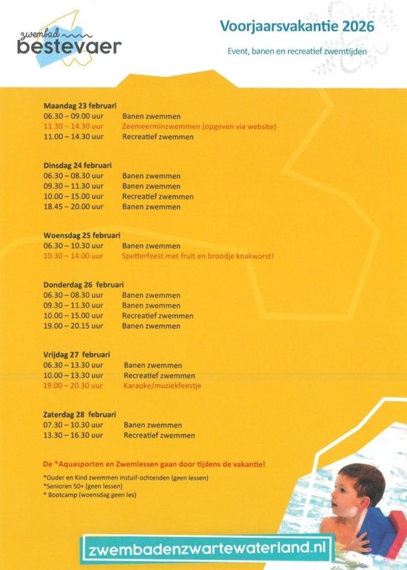 Tijdens de voorjaarsvakantie zijn er weer spetterende activiteiten te doen. Zo kun je meedoen aan het spetterfeest en genieten van een broodje knakworst, ranja en een appel. Vrijdagavond...muziekavond. Ook organiseren we een zeemeerminnen-clinic. Hiervoor kun je je binnenkort aanmelden via de link. Let op er zijn maar een beperkt aantal plekjes beschikbaar, dus wees er snel bij want vol = vol.